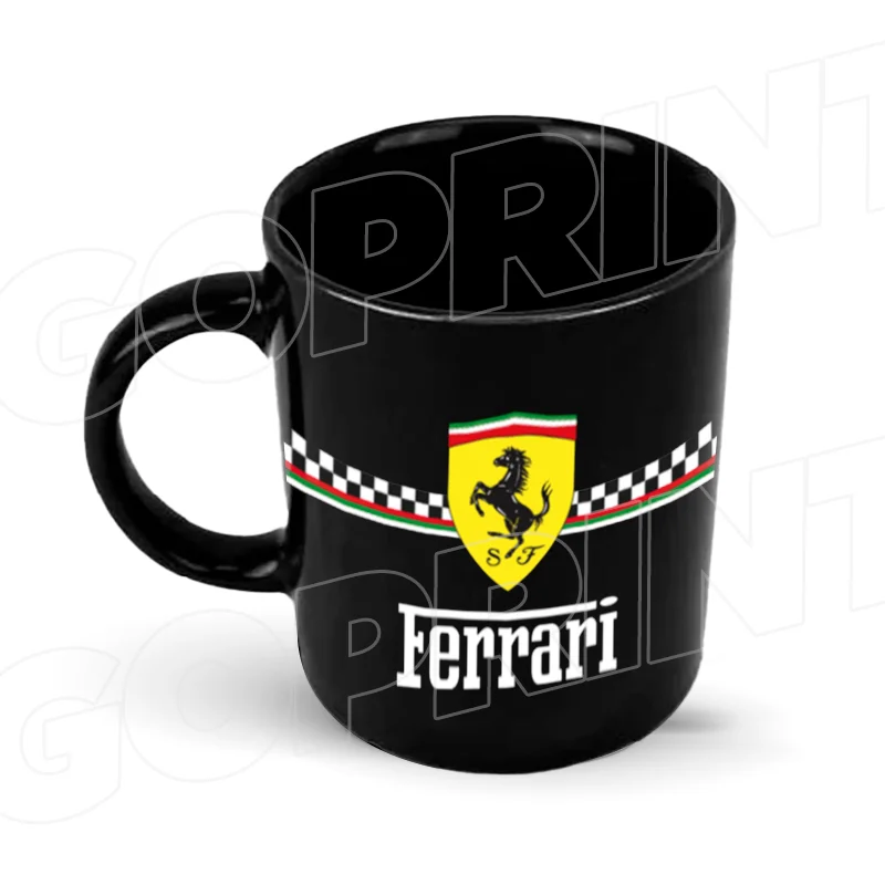 Impresionante taza negra completa. Diseñada para los verdaderos apasionados del automovilismo, esta taza es mucho más que un simple recipiente; es una celebración del poder, la innovación, y la velocidad que caracterizan al equipo Ferrari .